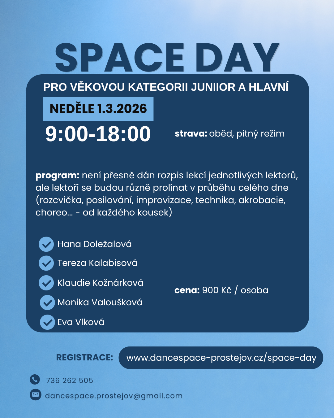 Zveme všechny tanečníky z věkové kategorie Junior a Hlavní na jedinečný taneční den Space Day, který se uskuteční 1. 3. 2026 od 9:00 do 18:00.