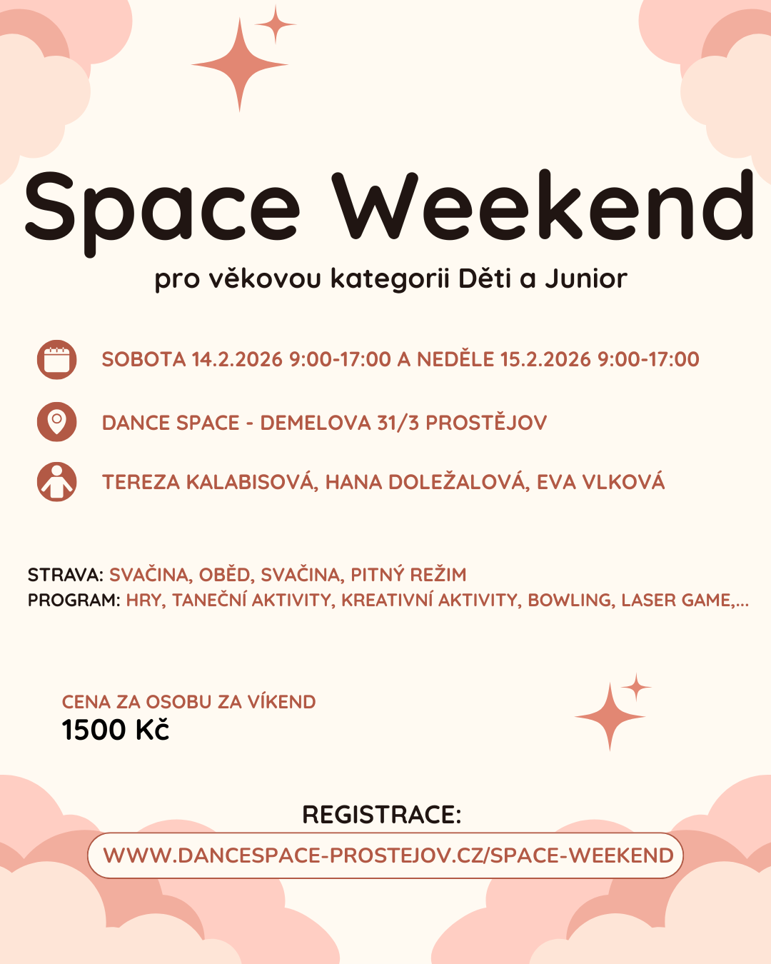 Zveme všechny tanečníky z věkové kategorie Děti a Junior na dvoudenní akci Space Weekend, která proběhne 14.–15. 2. 2026 v čase 9:00–17:00.